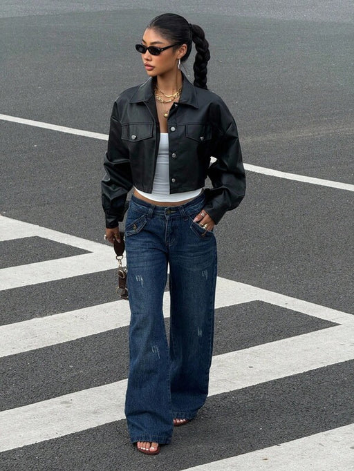 Women’s PU Leather Crop Jacket Drop Shoulder Button Casual Coat UK